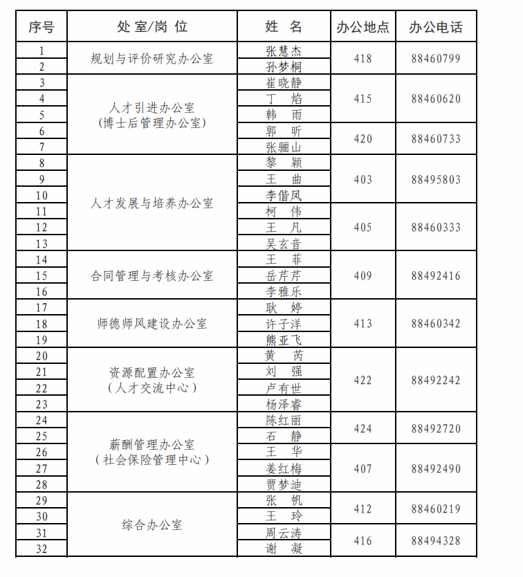 人力资源部负责学校教职工队伍建设、管理与服务工作,包括专业技术人员招聘、职务评定、岗位聘任、考核评估、薪酬与社保管理、人员调配、博士后管理、人事信息化系统建设等工作。党委教师工作部负责统筹教职员工的思想政治工作和师德师风建设。高层次人才办公室负责高层次人才引进、遴选、推荐和综合服务,同时负责人才特区的建设管理等业务。